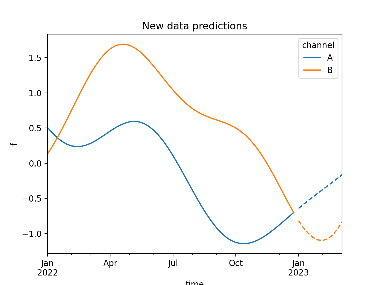import numpy as np import pandas as pd import pymc as pm import matplotlib.pyplot as plt from pymc_marketing.mmm import HSGP from pymc_extras.prior import Prior seed = sum(map(ord, "New data predictions")) rng = np.random.default_rng(seed) eta = Prior("Exponential", lam=1) ls = Prior("InverseGamma", alpha=2, beta=1) hsgp = HSGP( eta=eta, ls=ls, m=20, L=150, dims=("time", "channel"), ) n = 52 X = np.arange(n) dates = pd.date_range("2022-01-01", periods=n, freq="W-MON") coords = {"time": dates, "channel": ["A", "B"]} with pm.Model(coords=coords) as model: data = pm.Data("data", X, dims="time") hsgp.register_data(data).create_variable("f") idata = pm.sample_prior_predictive(random_seed=rng) prior = idata.prior n_new = 10 X_new = np.arange(n, n + n_new) new_dates = pd.date_range("2023-01-01", periods=n_new, freq="W-MON") with model: pm.set_data( new_data={ "data": X_new, }, coords={"time": new_dates}, ) post = pm.sample_posterior_predictive( prior, var_names=["f"], random_seed=rng, ) chain, draw = 0, 50 colors = ["C0", "C1"] def get_sample(curve): return curve.loc[chain, draw].to_series().unstack() ax = prior["f"].pipe(get_sample).plot(color=colors) post.posterior_predictive["f"].pipe(get_sample).plot( ax=ax, color=colors, linestyle="--", legend=False ) ax.set(xlabel="time", ylabel="f", title="New data predictions") plt.show()