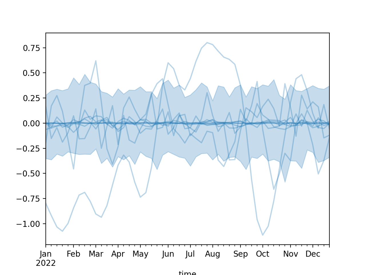 import numpy as np import pandas as pd import matplotlib.pyplot as plt from pymc_marketing.mmm import HSGP seed = sum(map(ord, "Out of the box GP")) rng = np.random.default_rng(seed) n = 52 X = np.arange(n) hsgp = HSGP.parameterize_from_data( X=X, dims="time", ) dates = pd.date_range("2022-01-01", periods=n, freq="W-MON") coords = { "time": dates, } prior = hsgp.sample_prior(coords=coords, random_seed=rng) curve = prior["f"] hsgp.plot_curve(curve, random_seed=rng) plt.show()